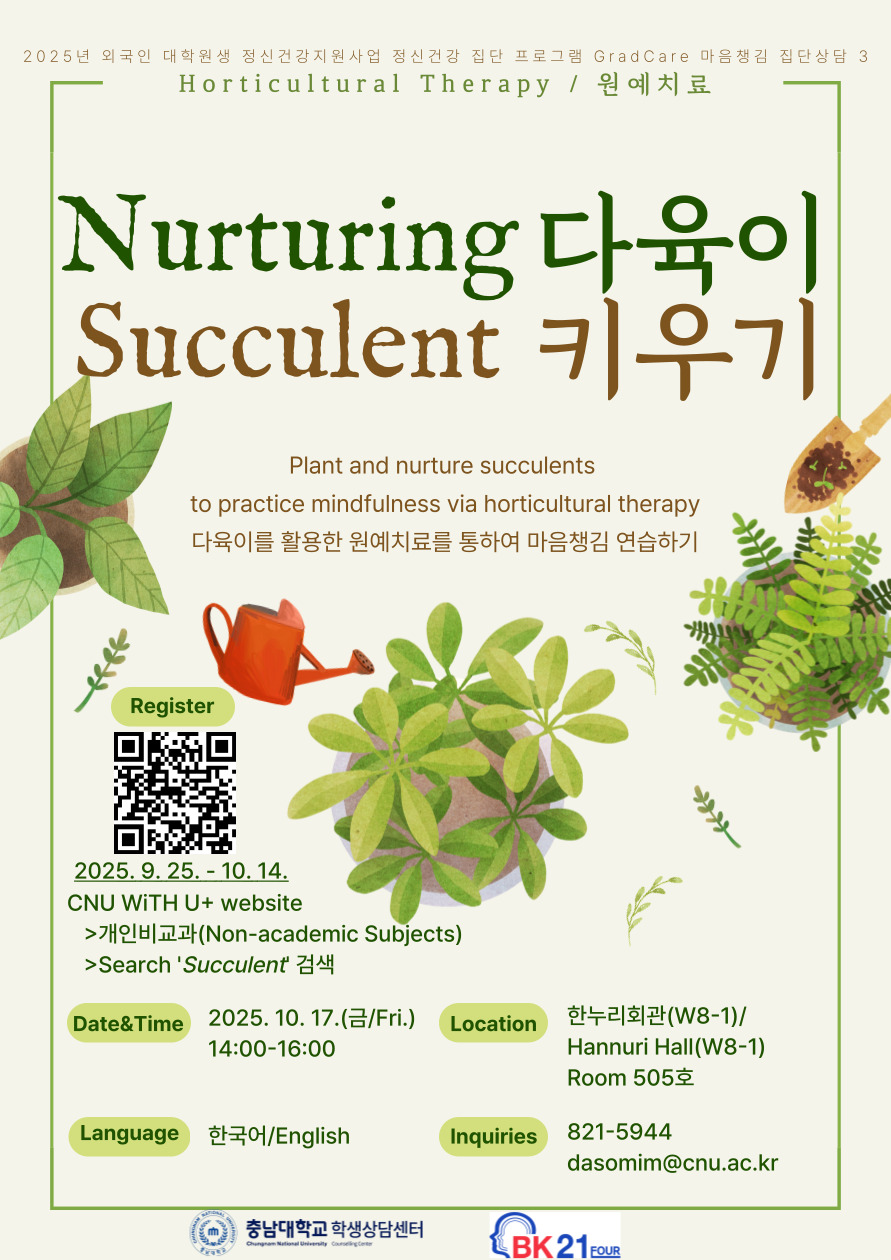 학생상담센터에서는 외국인 유학생의 스트레스 관리를 위하여 다육이를 활용한 원예치료 기반의 마음챙김 프로그램을 다음과 같이 운영합니다. 가. 모집대상: 재학 외국인 유학생 나. 모집인원: 10명(선착순 모집) 다. 모집일정: 2025. 9. 25.(목) ~ 10. 14.(화) 라. 운영일정: 2025. 10. 17.(금) 14:00-16:00 마. 장 소: 한누리회관(W8-1) 505호 바. 운영언어: 한국어 및 영어 사. 신청링크: https://with.cnu.ac.kr/ 아. 세부내용: <붙임 1> 참고 |
